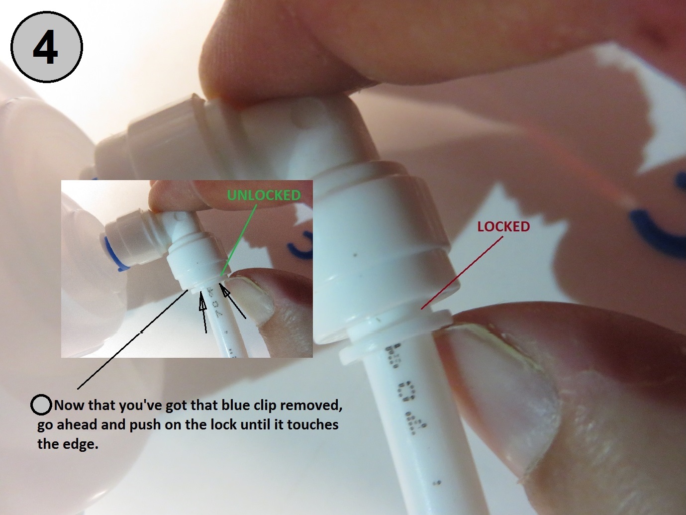 Once the blue clip is removed, push the lock inward toward the fitting.