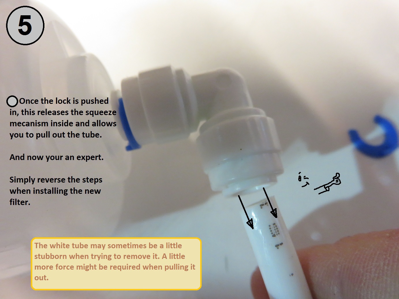 While holding the lock in, gently pull the tube outward to disconnect it.